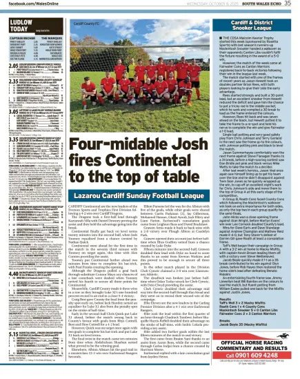 Taff’s Well begun their campaign in Group A with a 3-2 win at home to Macky Misfits, with captain Kevin Brown leading them off with a victory over Steve Wellbeloved. Jacob Boyle quickly made it 1-1 as a 35 break contributed to his win against Glyn Jones, before Rob Hayes restored the home side’s lead after defeating Renato Ridolini. An entertaining fourth frame saw Jimmy Llewellyn beat Bill Bainton on the colours to seal the match, but fluent potting from William Eades pulled one back for the Misfits against Justin Jones.
