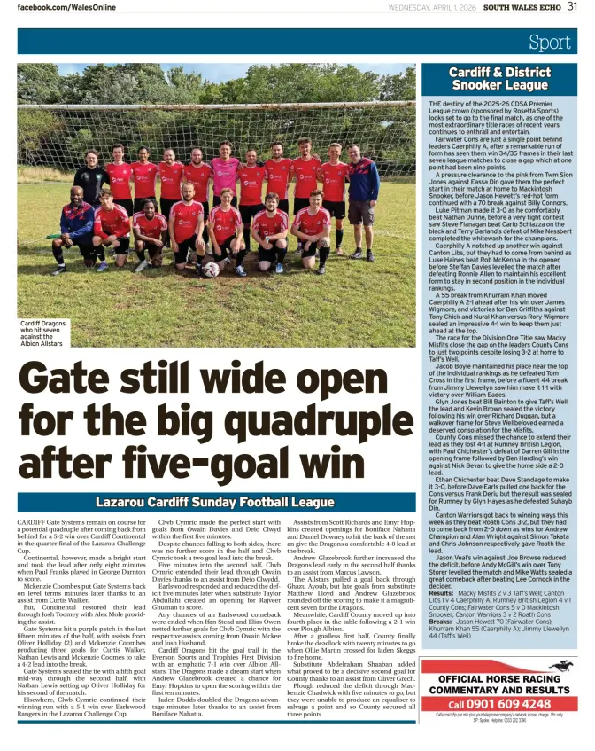 Caerphilly A have been top of the Premier League since the opening week and they notched up another win against Canton Libs, but they had to come from behind as Luke Haines beat Rob McKenna in the opener, before Steffan Davies levelled the match after defeating Ronnie Allen to maintain his excellent form to stay in second position in the individual rankings. A 55 break from Khurram Khan moved Caerphilly A 2-1 ahead after his win over James Wigmore, and victories for Ben Griffiths against Tony Chick and Nural Khan versus Rory Wigmore sealed an impressive 4-1 win to keep them just ahead at the top.